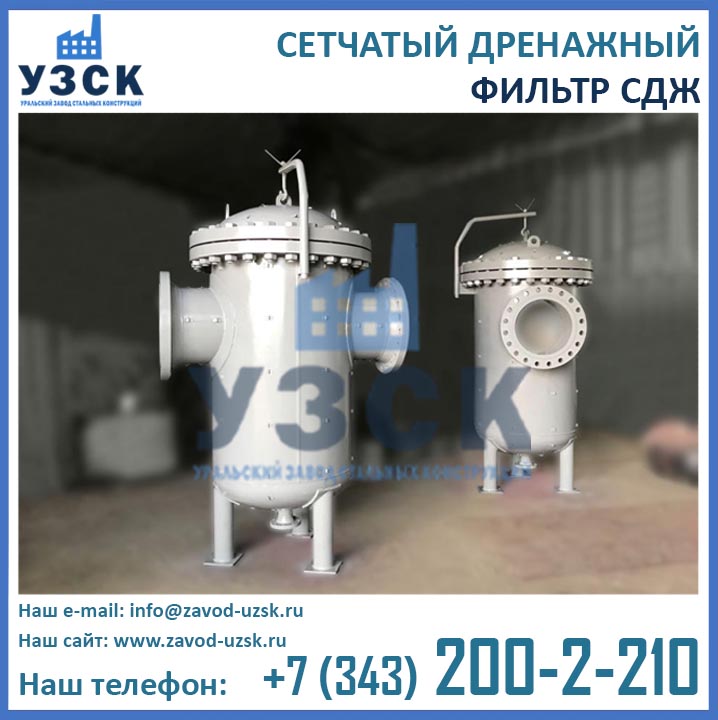 На формирование цены дренажного фильтра влияют следующие факторы: материальное исполнение, конструктивное исполнение, стоимость сырья в момент изготовления, комплектация, необходимость доставки в другой населенный пункт, срочность выполнения работ по изготовлению, прочие предпочтения заказчика. Уральский завод стальных конструкций изготавливает фильтры СДЖ-700 любого типового исполнения, а также нестандартные фильтры СДЖ 700 мм по чертежам заказчика или техническому заданию. Дополнительно к фильтрам СДЖ у нас Вы можете заказать сменные фильтрующие элементы любой тонкости фильтрации, ответные фланцы, прокладки и крепеж. По запросу изготавливаем также фильтры СДЖ-К-700 с концевым затвором. Для того чтобы узнать какова цена на фильтр СДЖ Ду700 в Оренбурге с необходимыми Вам характеристиками, отправьте запрос в отдел продаж завода УЗСК по координатам, указанным в разделе «Контакты».