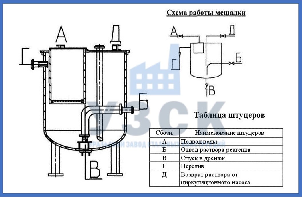 Цилиндрический бак с конусным днищем, переходящим в дренаж, выполняет растворение суспензии, используя для перемешивания поток воды, нагнетаемой насосом. Рабочий раствор отбирается, а оставшийся шлам удаляется через дренаж.