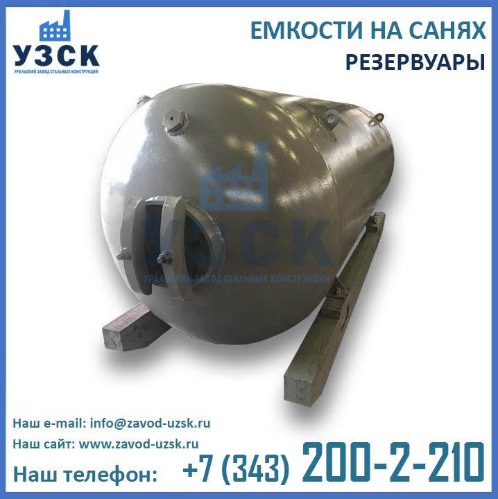 Разновидностью стальных горизонтальных резервуаров являются конструкции с опорой на санные полозья. Конструкции применимы там, где зима длится больше полугода, в районах с вечной мерзлотой. Устойчивая опора на полозья позволяет устанавливать емкости на санях в необорудованном месте. Для передвижения по снежному и ледяному накату используется буксировка конструкции с помощью трактора или вездехода.